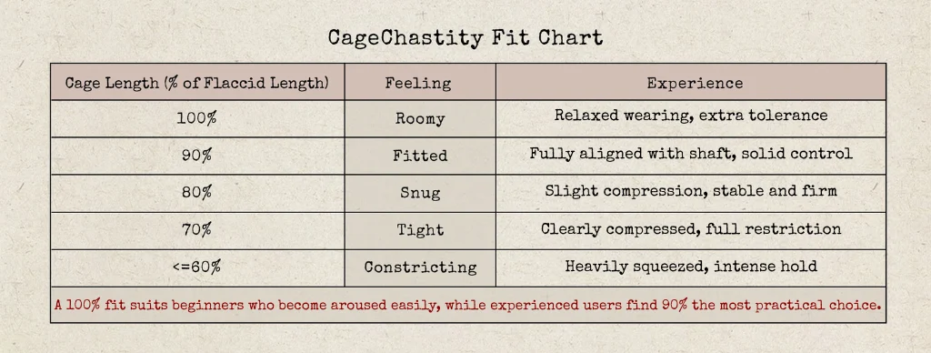 For those who are already accustomed to wearing a cage, reducing the length to around 90% of your flaccid measurement can be a more suitable option. At that point, the body tends to respond more calmly, and a shorter fit can feel more natural for ongoing wear. As with most aspects of chastity, experience plays a significant role in determining what works best.