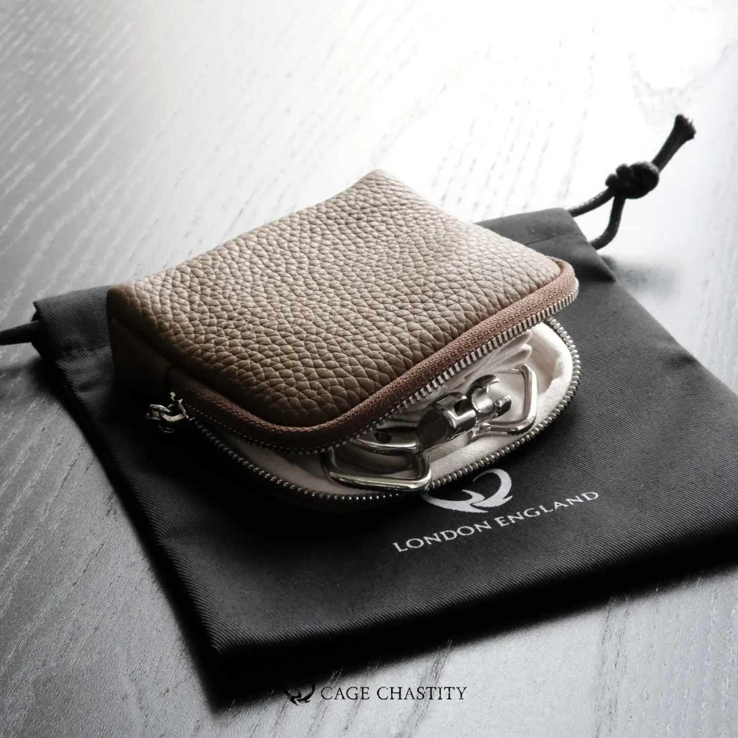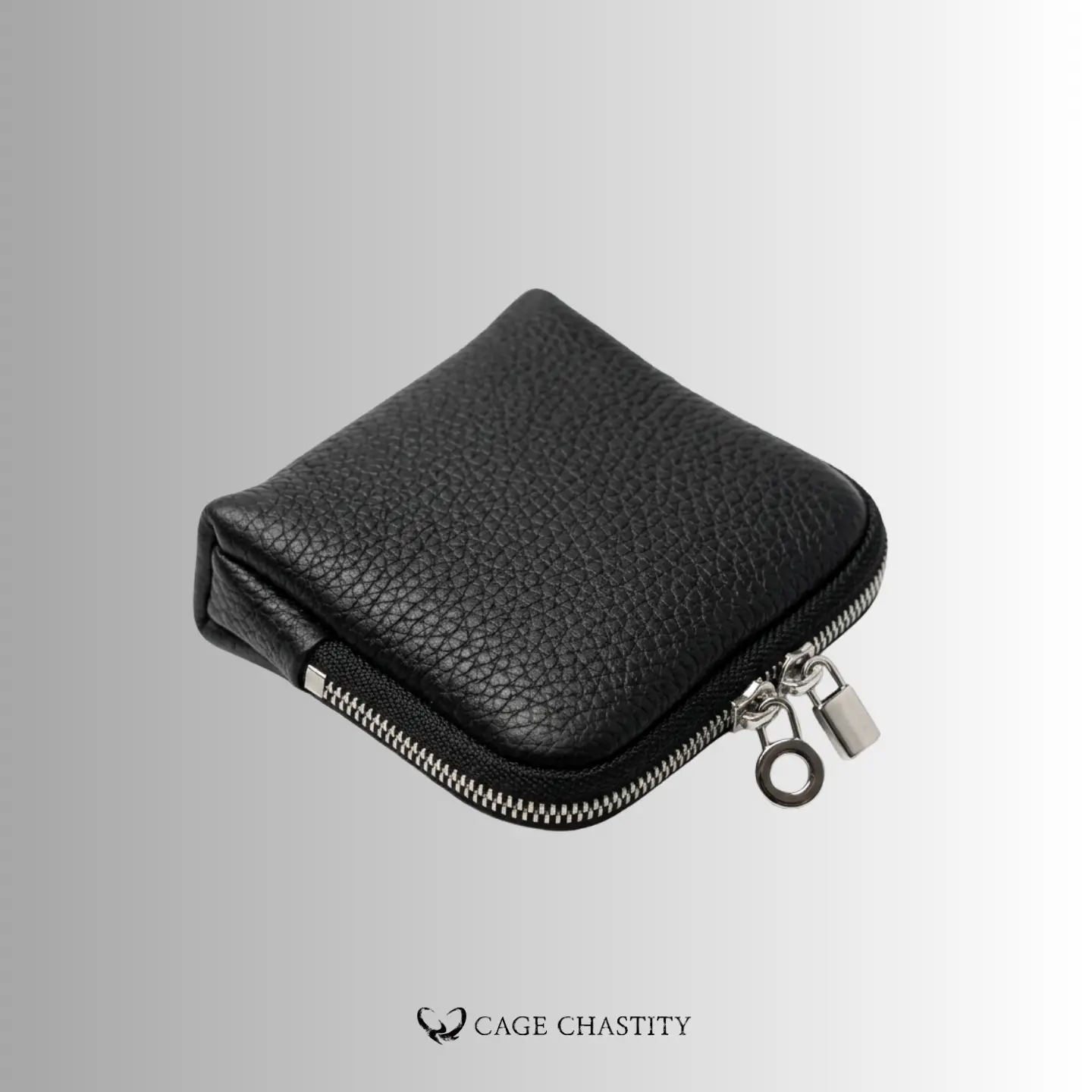 A discreet, water-resistant full-grain leather storage case designed for chastity devices and accessories. Features a 6-compartment interior to protect, organize, and prevent metal-on-metal scratches during daily carry.