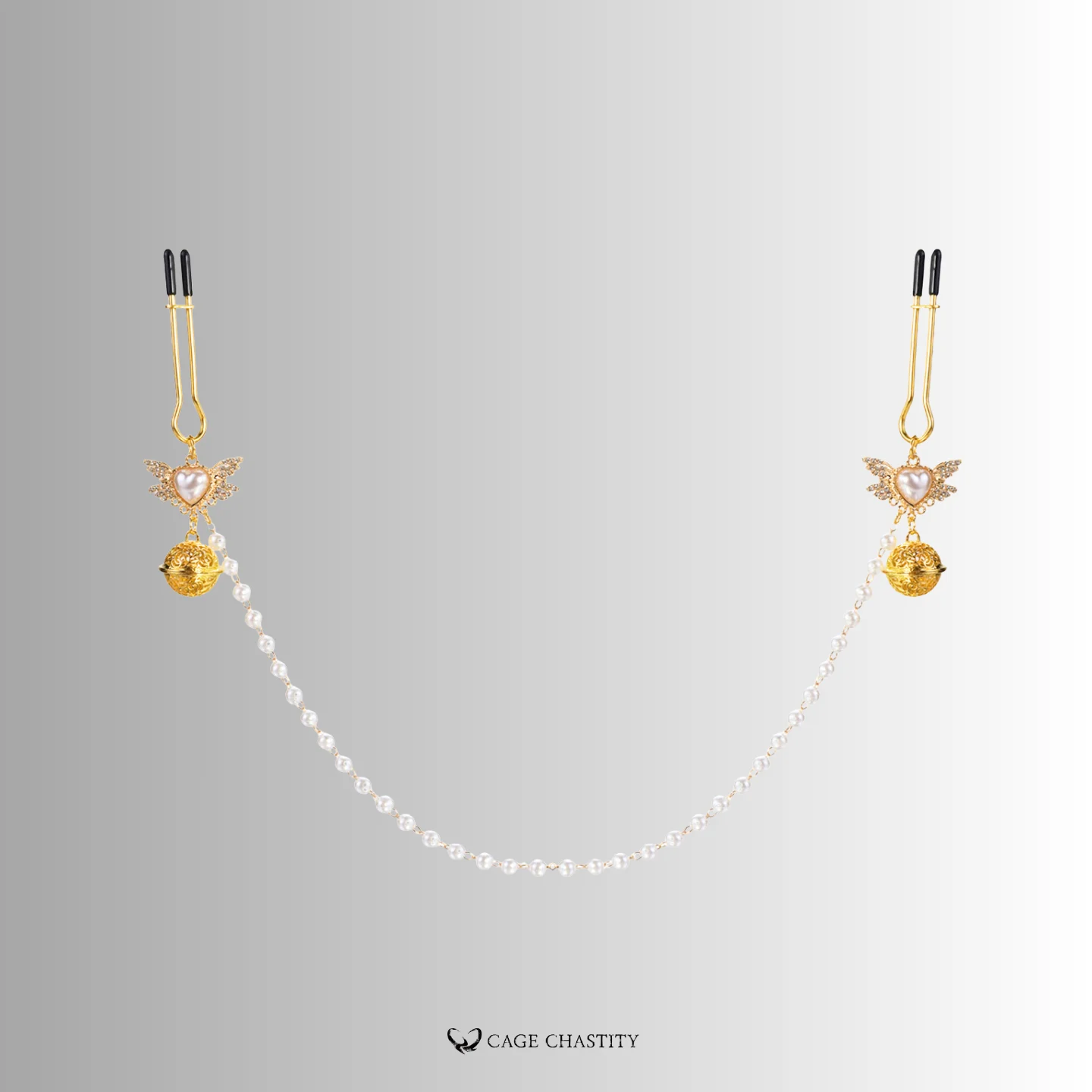 Pearl-linked nipple nooses with wing and bell details. Made for graceful restraint and visual submission.