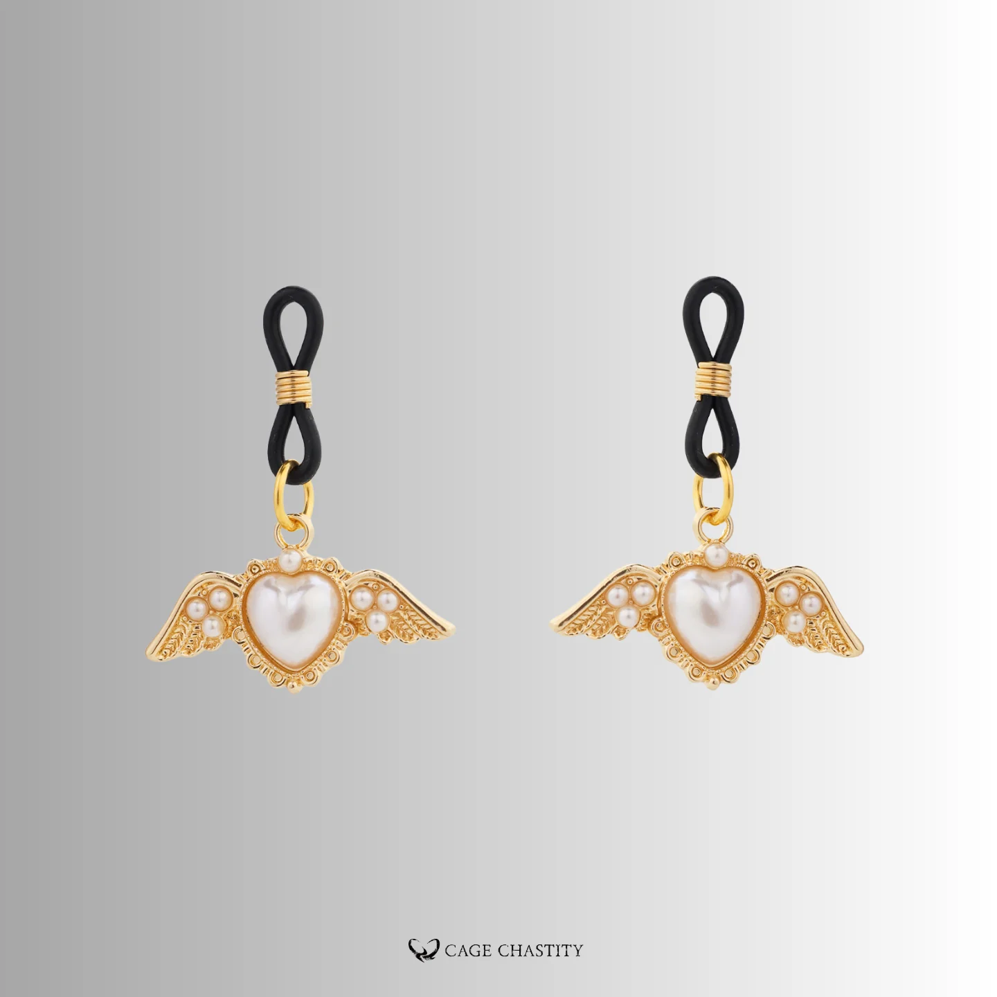 The FeatherKiss Nipple Noose wraps each nipple with a loop of gentle pressure and adds a quiet visual message. A heart-shaped pearl rests at the end, framed by a pair of golden wings that slope downward like a soft surrender. There’s no sound, no movement—just a still, elegant symbol that turns your chest into something to be admired and controlled. This piece is made for those who see beauty in obedience and take their submission seriously, even in silence.